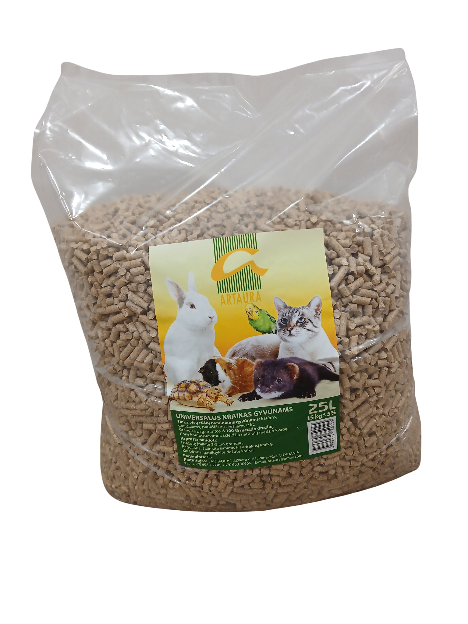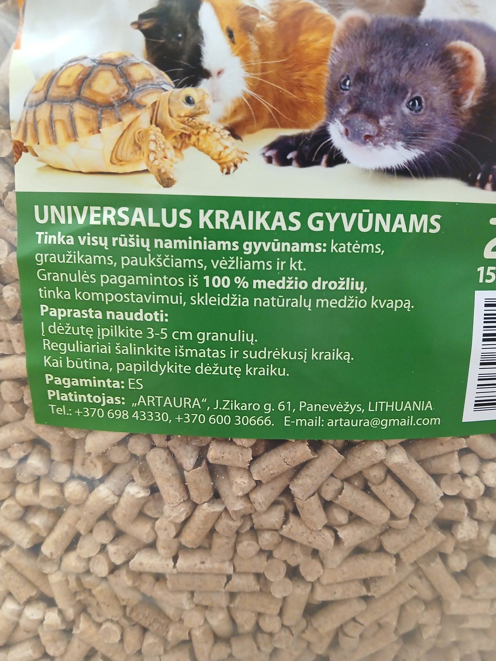 100% natūralus, ekologiškas MEDŽIO DROŽLIŲ GRANULIUOTAS kraikas. Tinka visų rūšių naminiams gyvūnams: katėms, paukščiams, vėžliams, triušiams, įvairių rūšių graužikams ir kt.